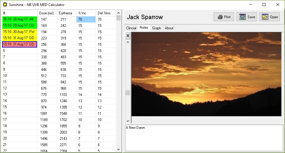 Hence all Notes require an accompanying image to be “drag & dropped” onto the application. The commentry is linked with the image and is then able to be stored / retrieved from the UVB file along with the treatment record.